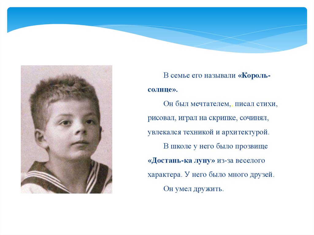 В семье его называли «Корольсолнце».Он был мечтателем,, писал стихи,