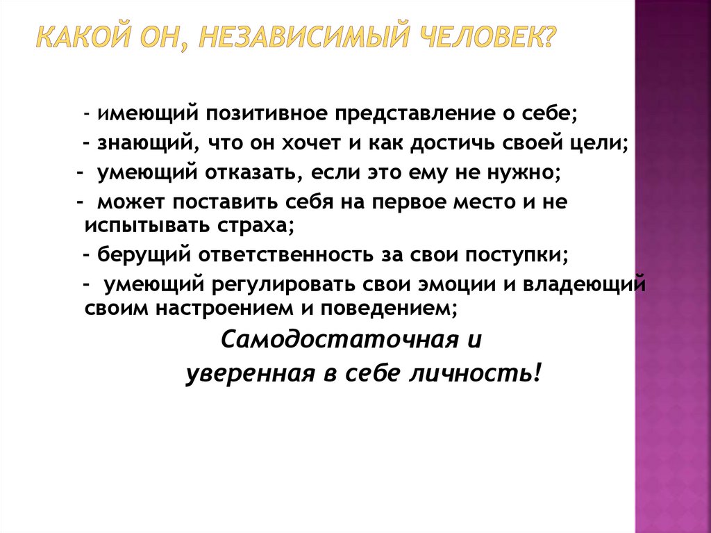 - имеющий позитивное представление о себе;- знающий, что он хочет и как достичь своей цели;
