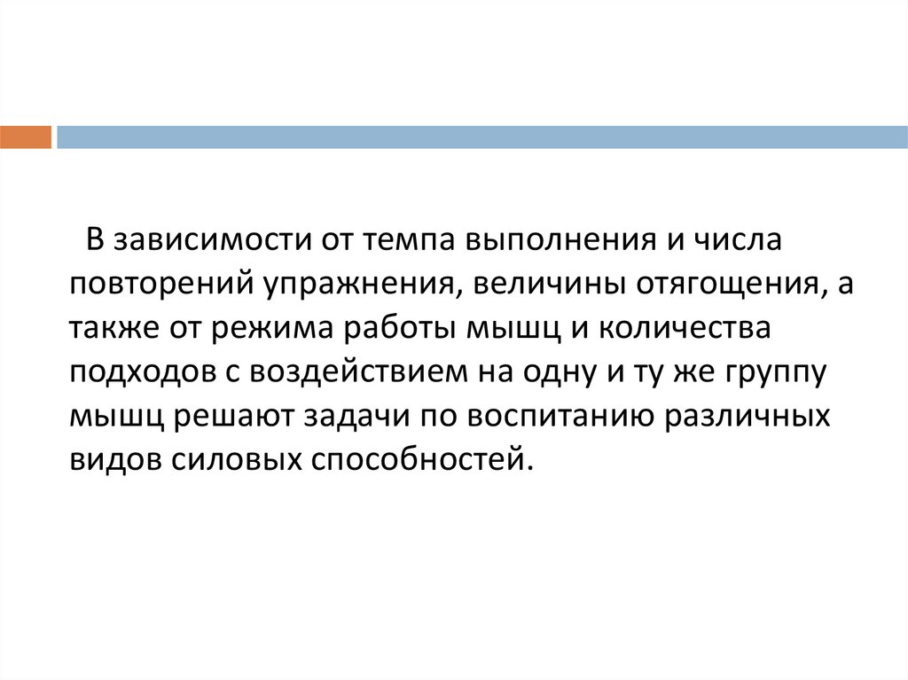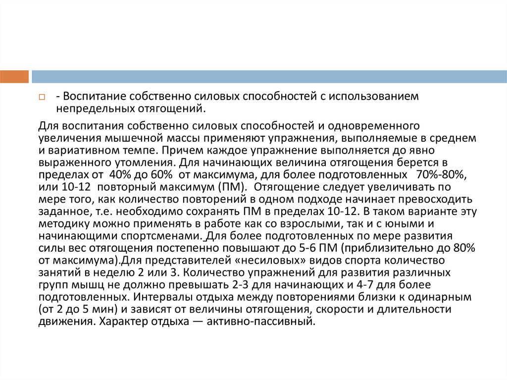 - Воспитание собственно силовых способностей с использованиемнепредельных отягощений.