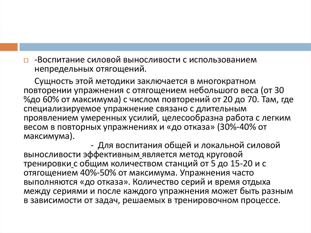 -Воспитание силовой выносливости с использованиемнепредельных отягощений.