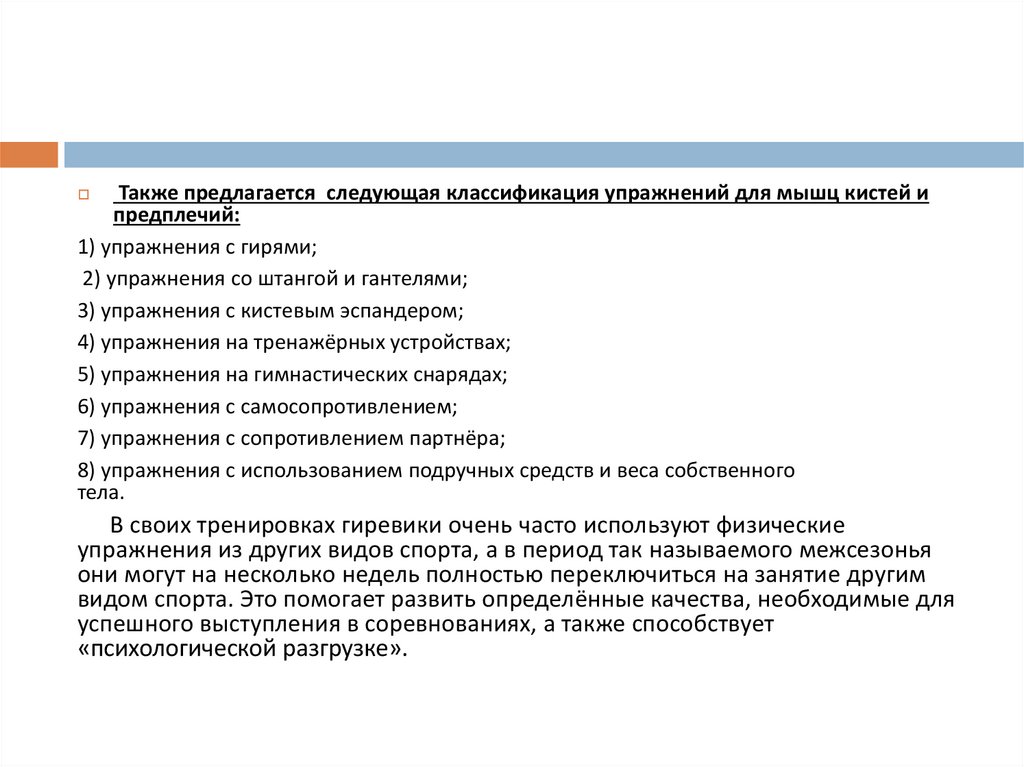 Также предлагается следующая классификация упражнений для мышц кистей ипредплечий: