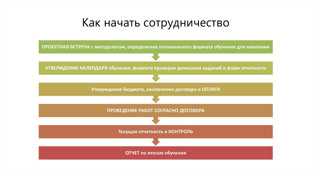 Как начать сотрудничествоПРОЕКТНАЯ ВСТРЕЧА с методологом, определение оптимального формата обучения для компании