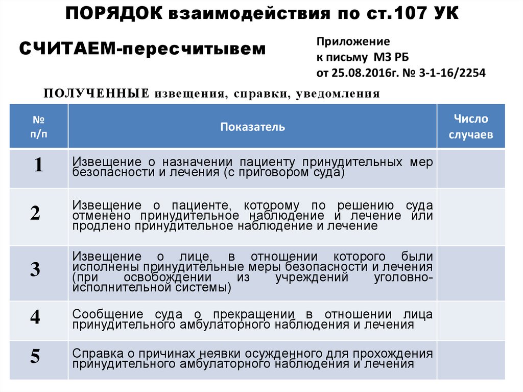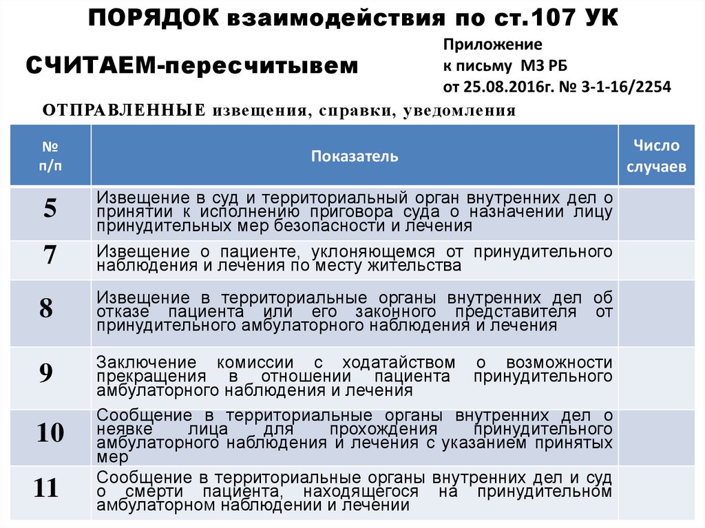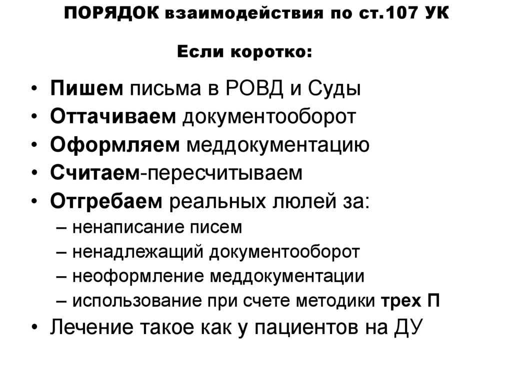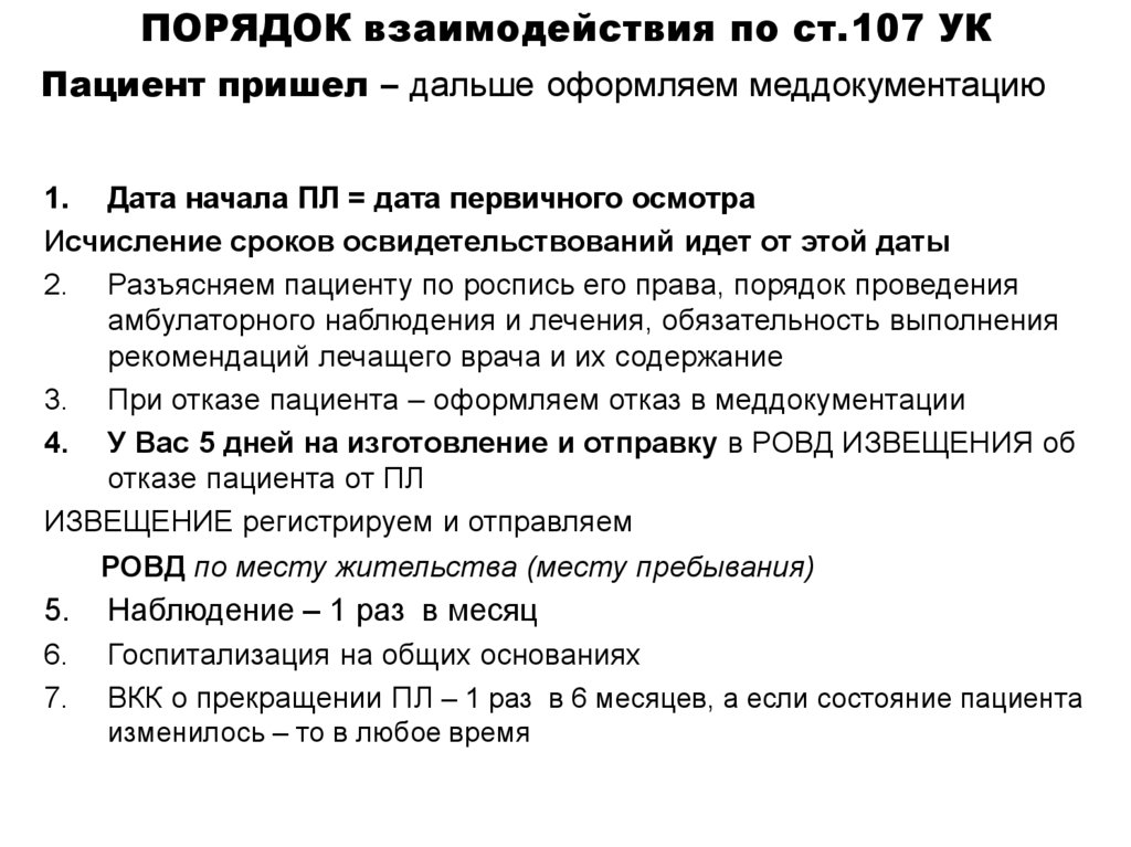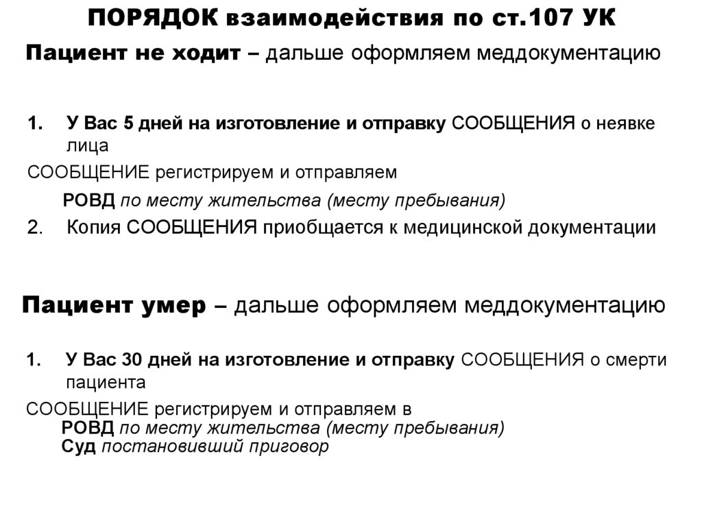 ПОРЯДОК взаимодействия по ст.107 УКПациент не ходит – дальше оформляем меддокументацию
