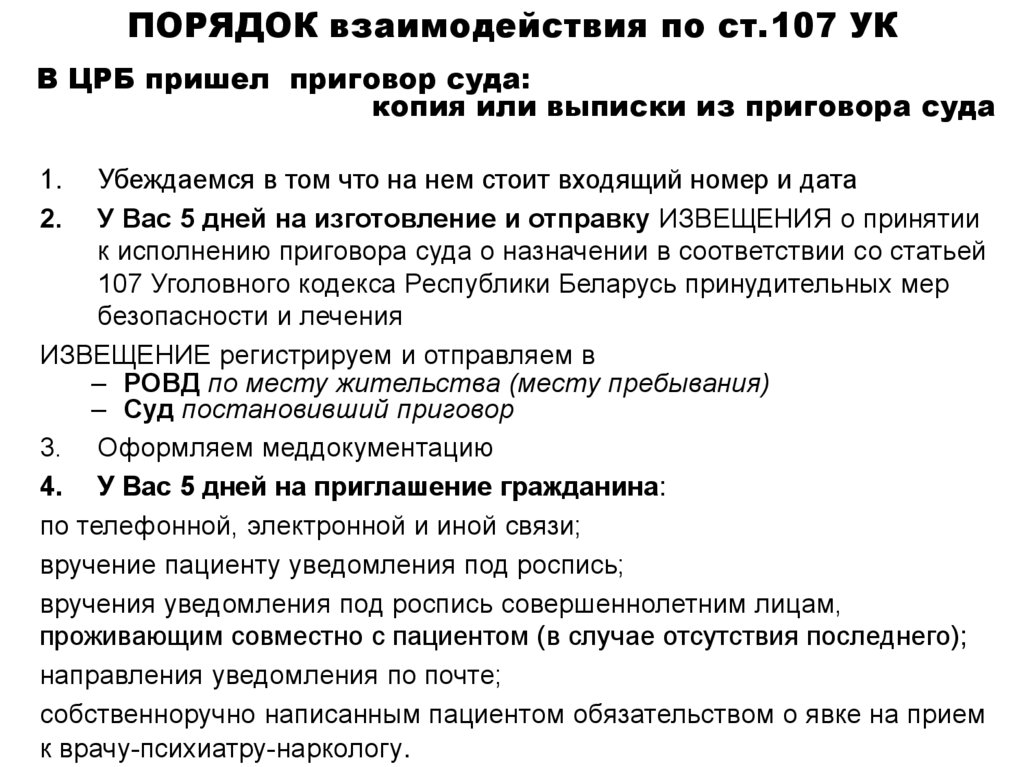 ПОРЯДОК взаимодействия по ст.107 УКПациент пришел – дальше оформляем меддокументацию
