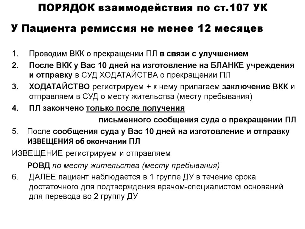 ПОРЯДОК взаимодействия по ст.107 УКУ Пациента ремиссия не менее 12 месяцев