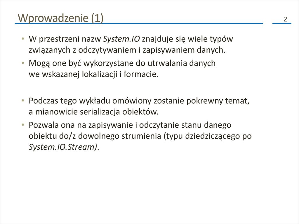 Wprowadzenie (1)• W przestrzeni nazw System.IO znajduje się wiele typów
