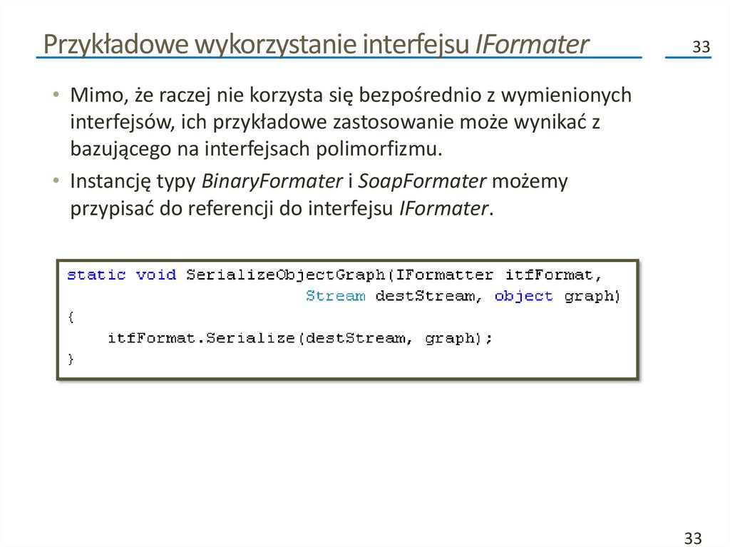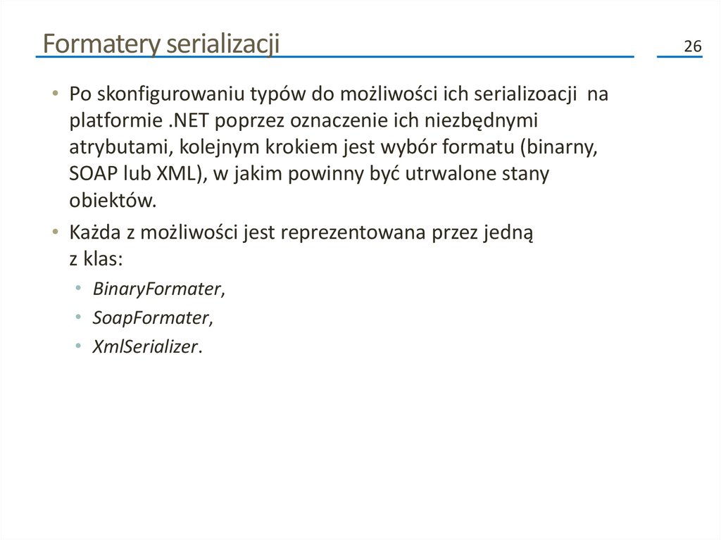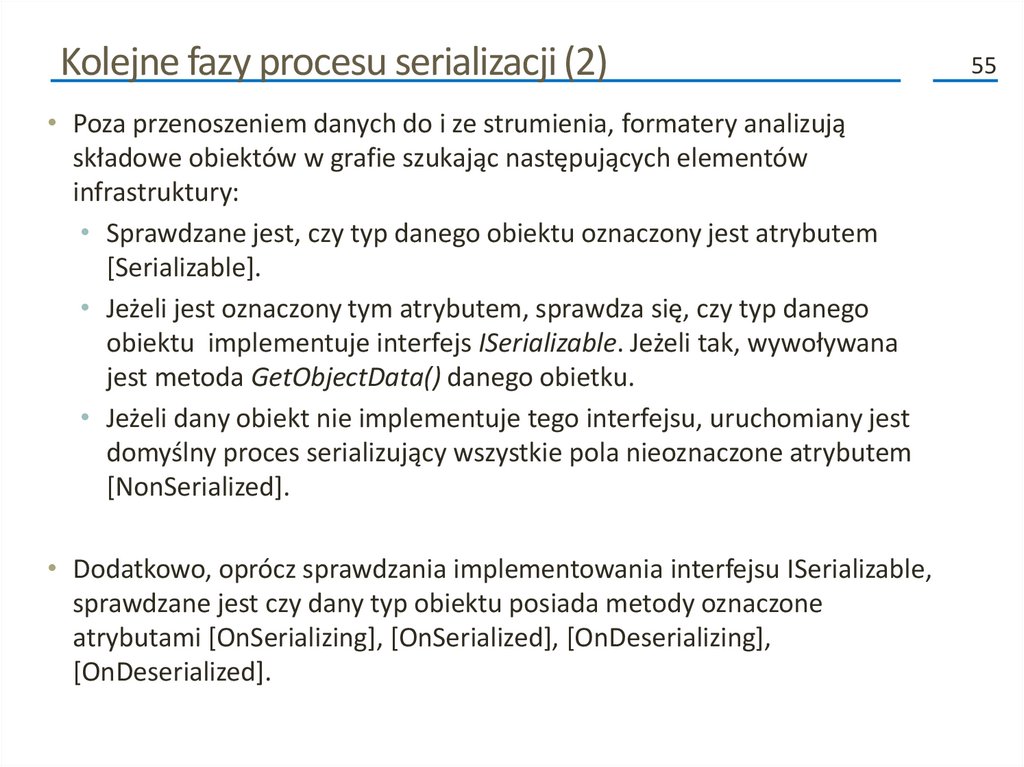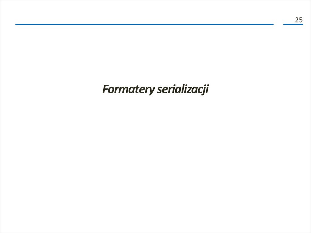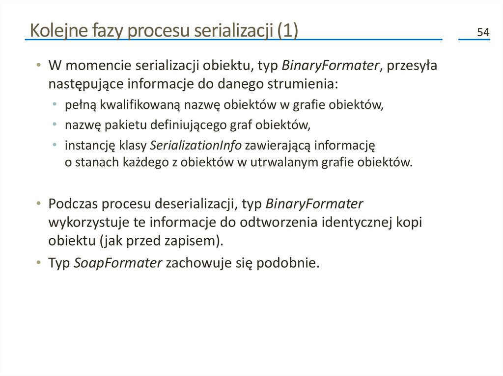 Kolejne fazy procesu serializacji (2)• Poza przenoszeniem danych do i ze strumienia, formatery analizują