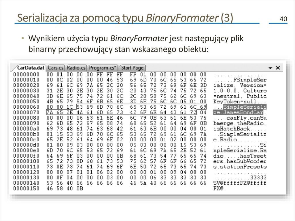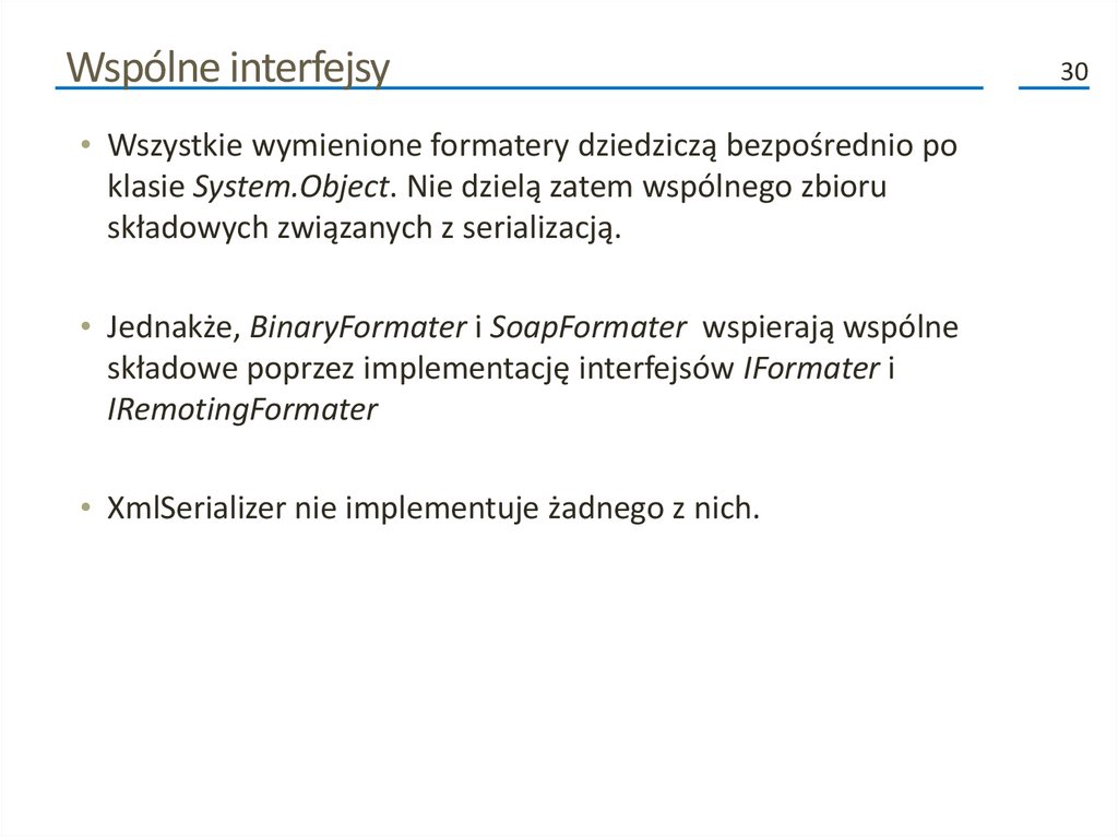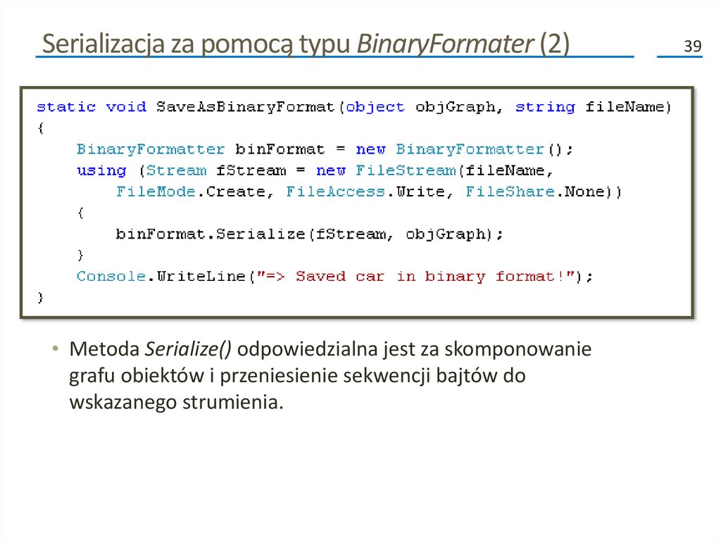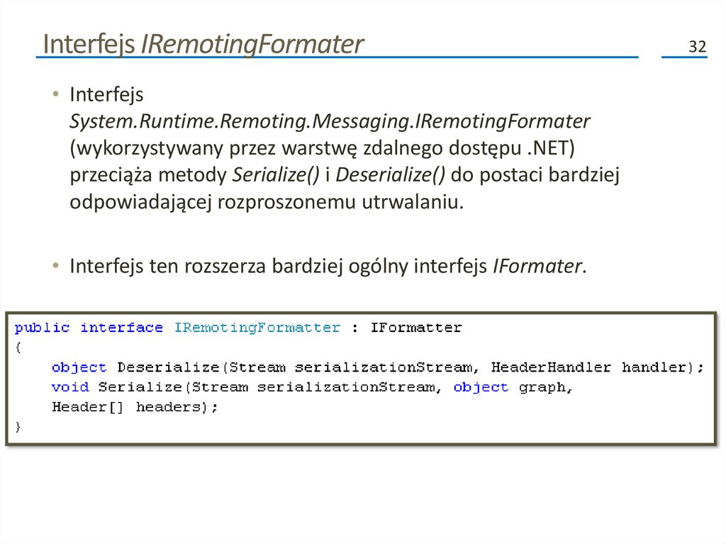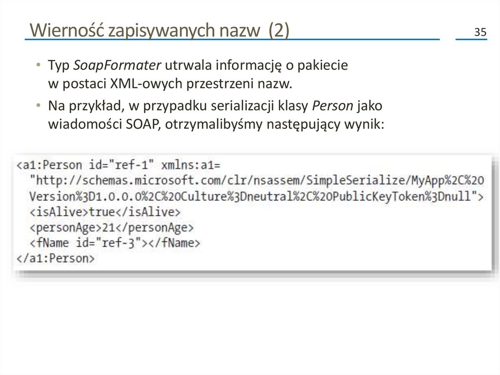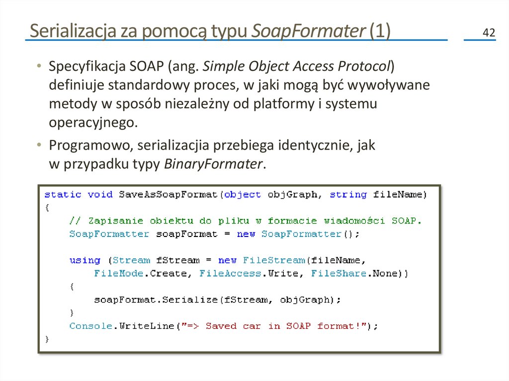 Kolejne fazy procesu serializacji (2)• Poza przenoszeniem danych do i ze strumienia, formatery analizują