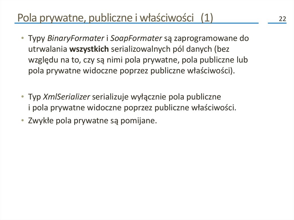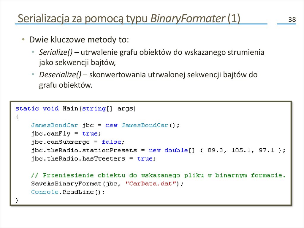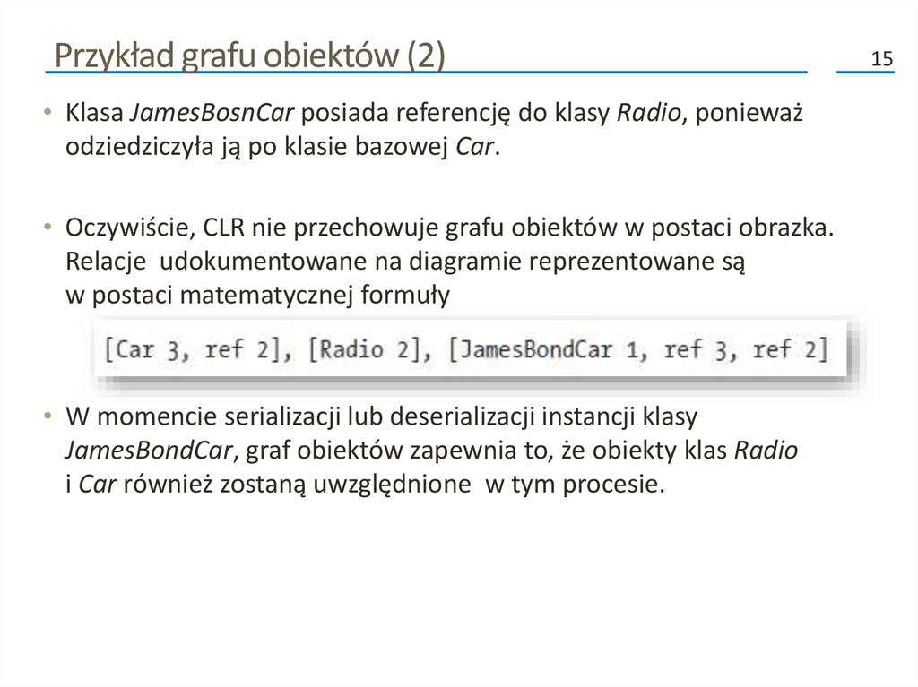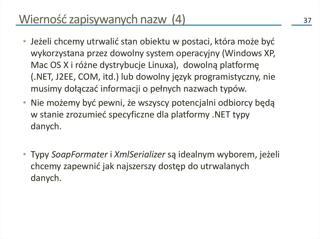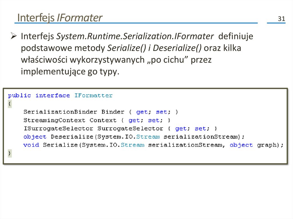 Kolejne fazy procesu serializacji (2)• Poza przenoszeniem danych do i ze strumienia, formatery analizują