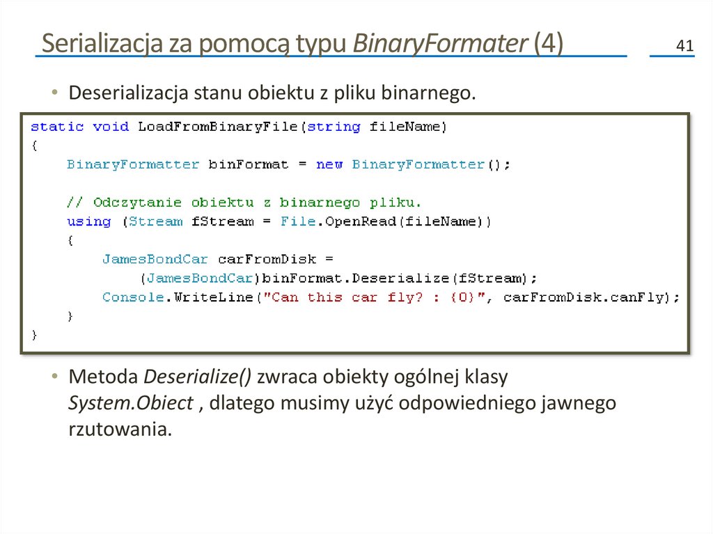 • Podczas procesu deserializacji, typ BinaryFormater