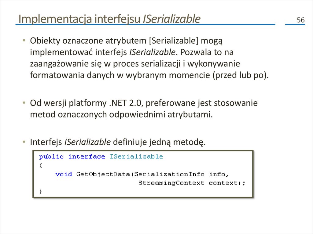 Implementacja interfejsu ISerializable• Obiekty oznaczone atrybutem [Serializable] mogą