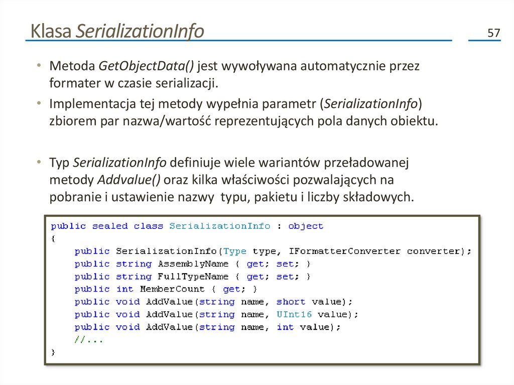 • Typ SerializationInfo definiuje wiele wariantów przeładowanej