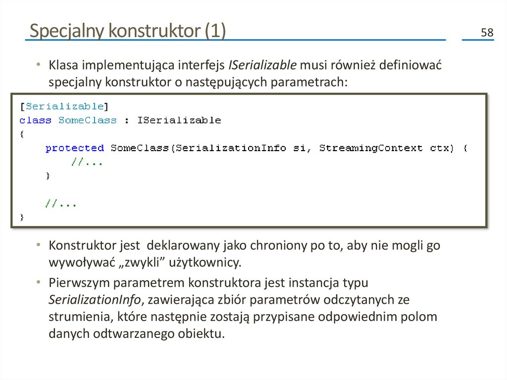 Specjalny konstruktor (1)• Klasa implementująca interfejs ISerializable musi również definiować