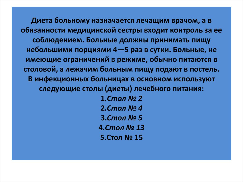 Диета больному назначается лечащим врачом, а вобязанности медицинской сестры входит контроль за ее
