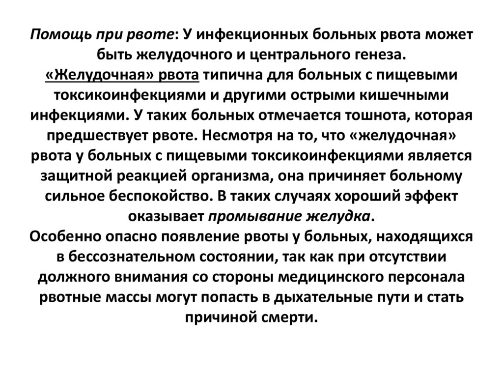 Помощь при рвоте: У инфекционных больных рвота можетбыть желудочного и центрального генеза.