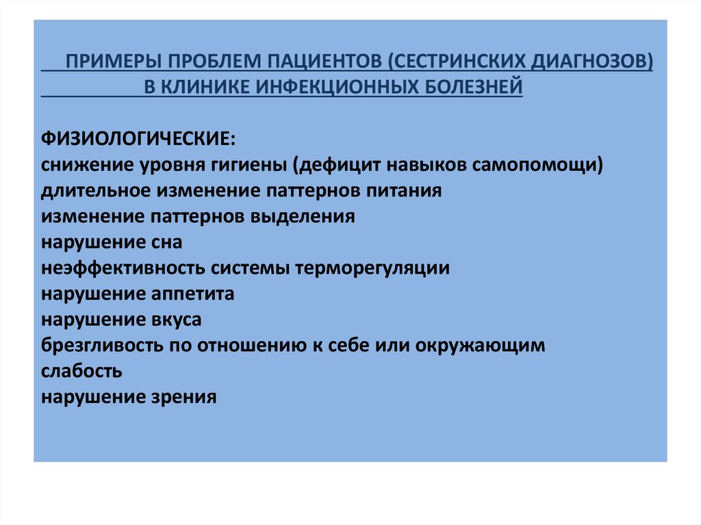 ПРИМЕРЫ ПРОБЛЕМ ПАЦИЕНТОВ (СЕСТРИНСКИХ ДИАГНОЗОВ)В КЛИНИКЕ ИНФЕКЦИОННЫХ БОЛЕЗНЕЙ