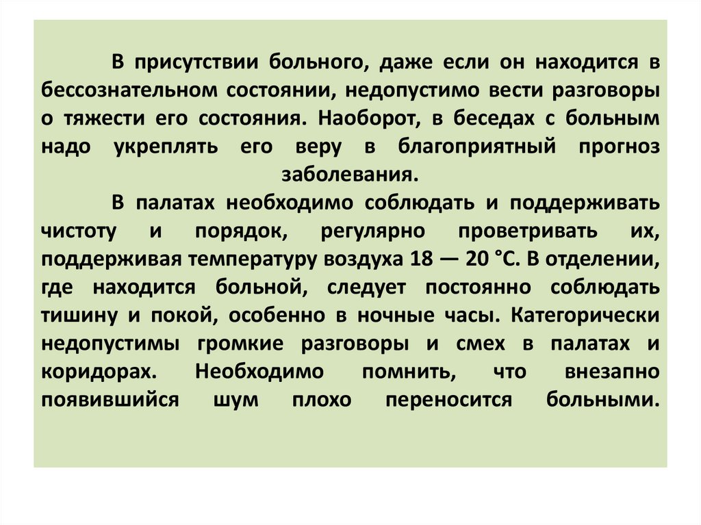 В присутствии больного, даже если он находится вбессознательном состоянии, недопустимо вести разговоры