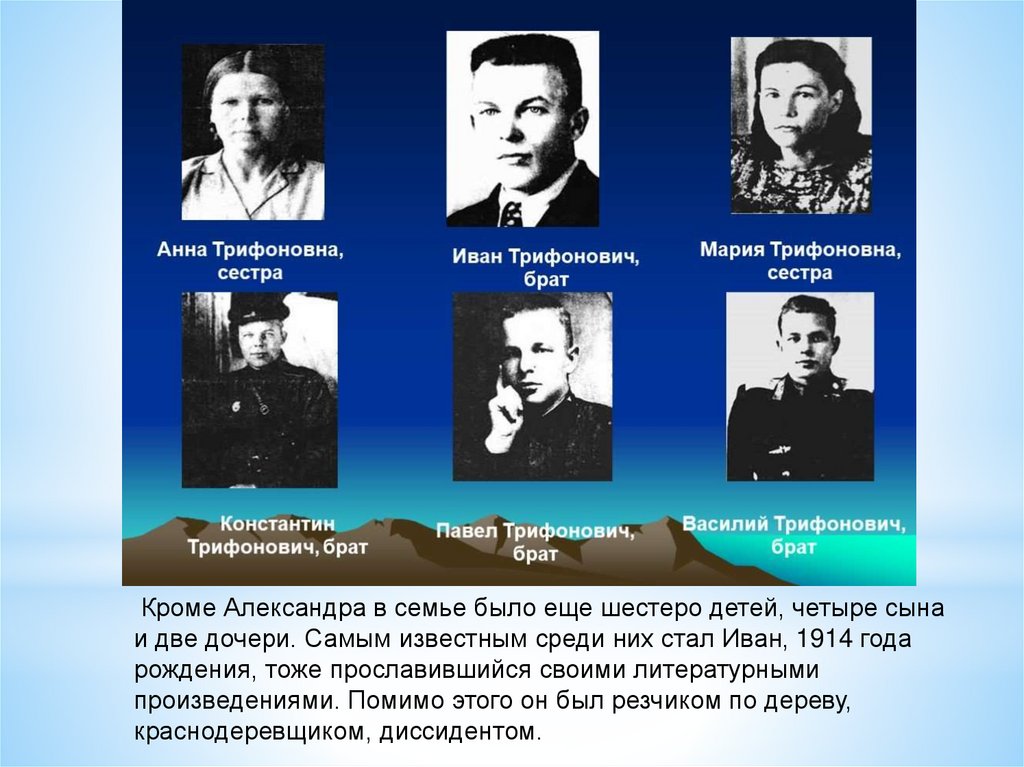 Кроме Александра в семье было еще шестеро детей, четыре сынаи две дочери. Самым известным среди них стал Иван, 1914 года