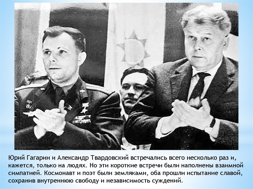 Юрий Гагарин и Александр Твардовский встречались всего несколько раз и,кажется, только на людях. Но эти короткие встречи были наполнены взаимной