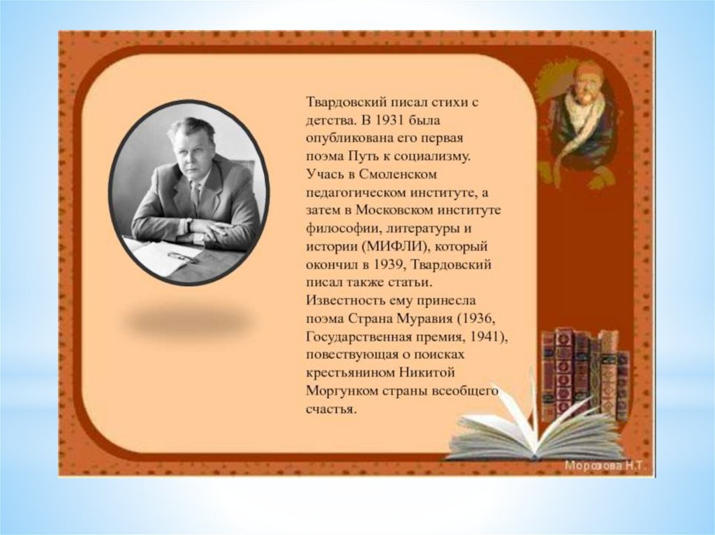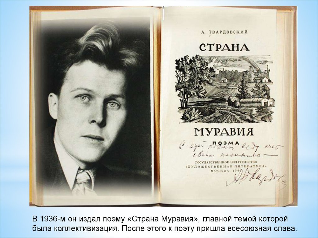 В 1936-м он издал поэму «Страна Муравия», главной темой которойбыла коллективизация. После этого к поэту пришла всесоюзная слава.