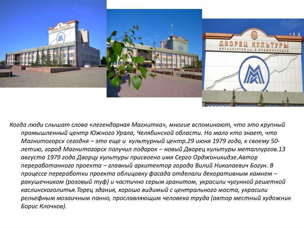 Магнитогорск сегодня – это еще и культурный центр.29 июня 1979 года, к своему 50летию, город Магнитогорск получил подарок – новый Дворец культуры металлургов.13