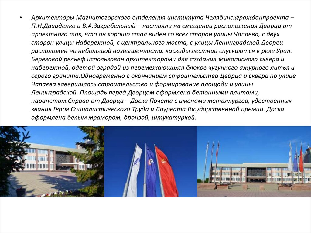 парапетом.Справа от Дворца – Доска Почета с именами металлургов, удостоенных