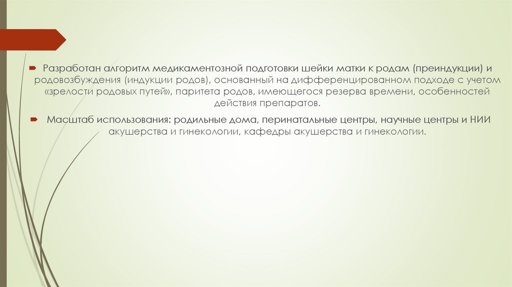 Разработан алгоритм медикаментозной подготовки шейки матки к родам (преиндукции) иродовозбуждения (индукции родов), основанный на дифференцированном подходе с учетом