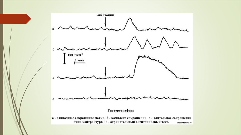 раствора или 0,05 ЕД окситоцина. Тест считается положительным, если сокращение матки в ответ на введение