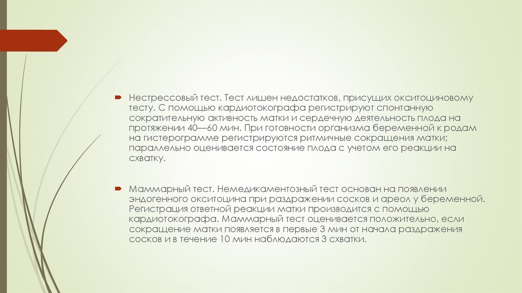 Нестрессовый тест. Тест лишен недостатков, присущих окситоциновомутесту. С помощью кардиотокографа регистрируют спонтанную