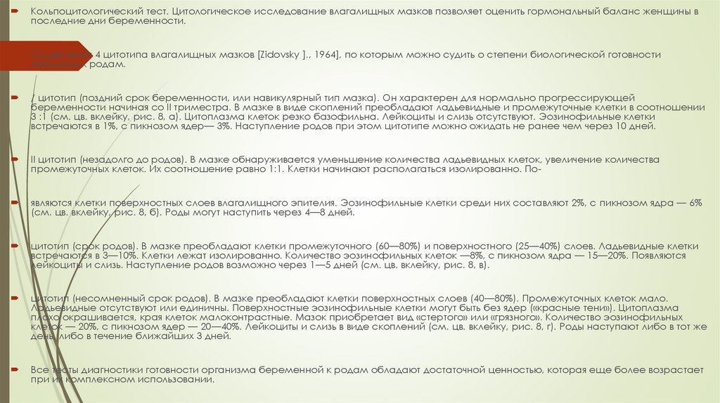 цитотип (несомненный срок родов). В мазке преобладают клетки поверхностных слоев (40—80%). Промежуточных клеток мало.