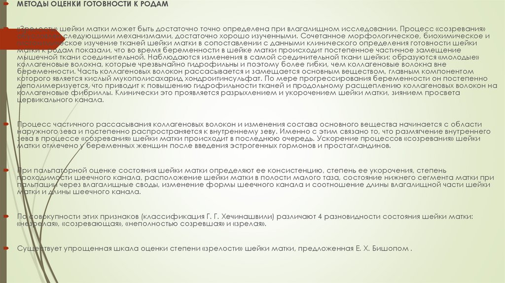 МЕТОДЫ ОЦЕНКИ ГОТОВНОСТИ К РОДАМ«Зрелость» шейки матки может быть достаточно точно определена при влагалищном исследовании. Процесс «созревания»