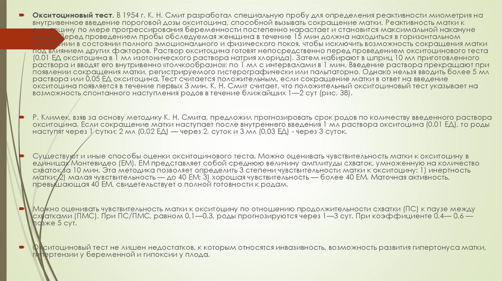 Окситоциновый тест. В 1954 г. К. Н. Смит разработал специальную пробу для определения реактивности миометрия навнутривенное введение пороговой дозы окситоцина, способной вызывать сокращение матки. Реактивность матки к
