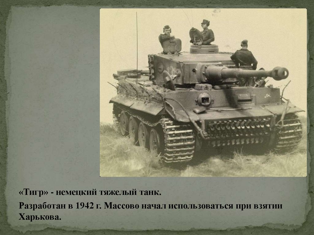 «Тигр» - немецкий тяжелый танк.Разработан в 1942 г. Массово начал использоваться при взятии