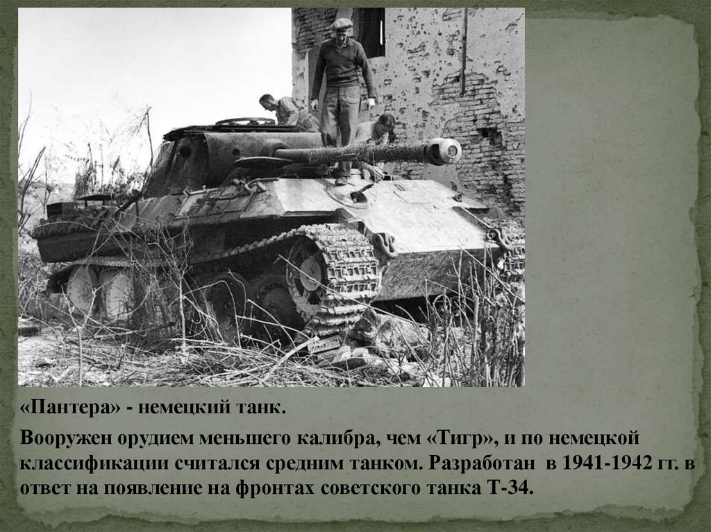 «Пантера» - немецкий танк.Вооружен орудием меньшего калибра, чем «Тигр», и по немецкой
