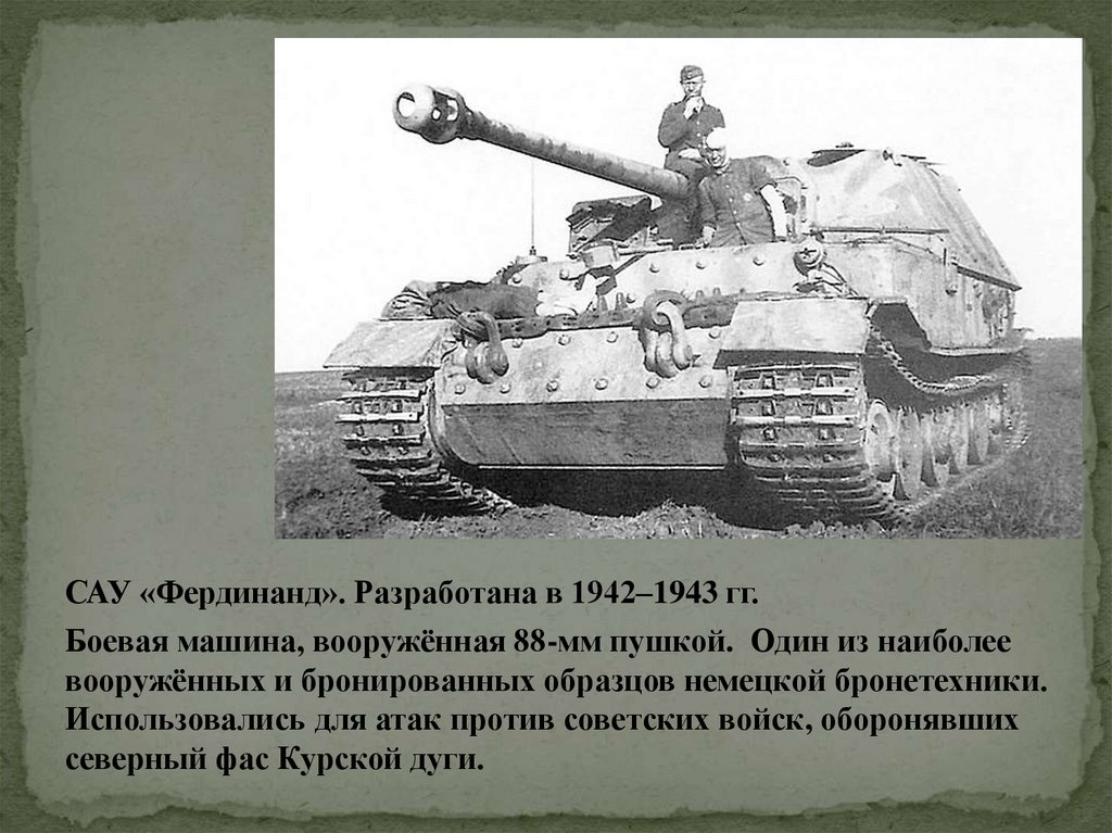 САУ «Фердинанд». Разработана в 1942–1943 гг.Боевая машина, вооружённая 88-мм пушкой. Один из наиболее
