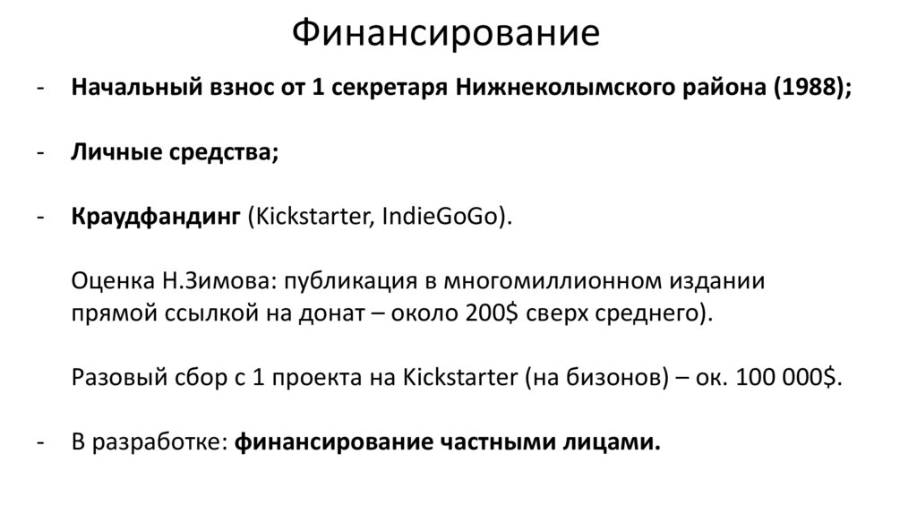Финансирование- Начальный взнос от 1 секретаря Нижнеколымского района (1988);