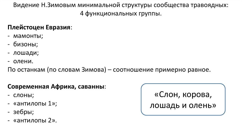 Видение Н.Зимовым минимальной структуры сообщества травоядных:4 функциональных группы.