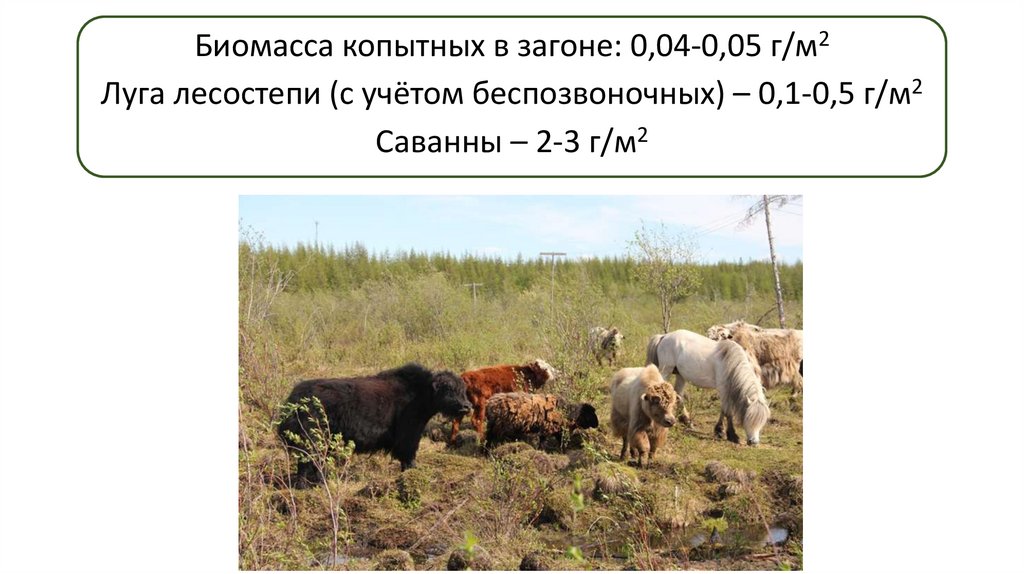 Биомасса копытных в загоне: 0,04-0,05 г/м2Луга лесостепи (с учётом беспозвоночных) – 0,1-0,5 г/м2