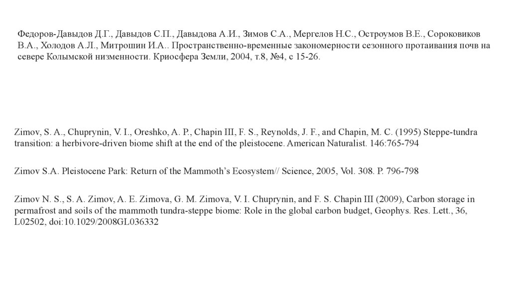 Zimov S.A. Pleistocene Park: Return of the Mammoth’s Ecosystem// Science, 2005, Vol. 308. P. 796-798