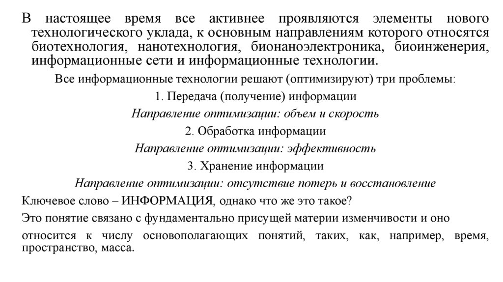 В настоящее время все активнее проявляются элементы новоготехнологического уклада, к основным направлениям которого относятся