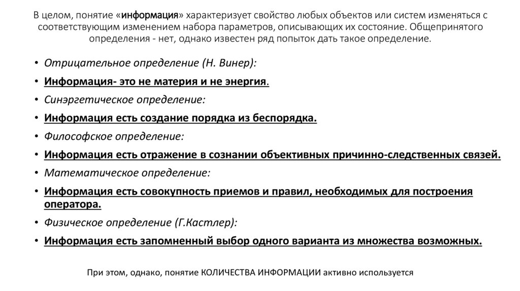 При этом, однако, понятие КОЛИЧЕСТВА ИНФОРМАЦИИ активно используется