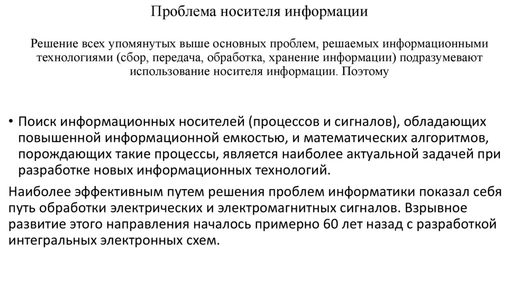 Проблема носителя информацииРешение всех упомянутых выше основных проблем, решаемых информационными