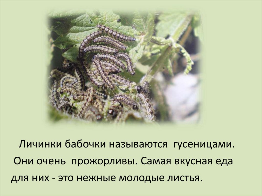 Личинки бабочки называются гусеницами.Они очень прожорливы. Самая вкусная еда
