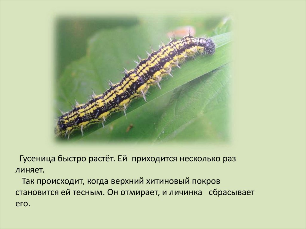 Гусеница быстро растёт. Ей приходится несколько разлиняет.