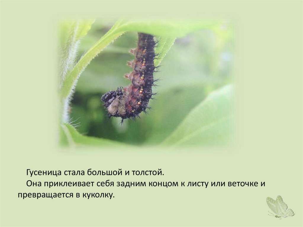 Гусеница стала большой и толстой.Она приклеивает себя задним концом к листу или веточке и