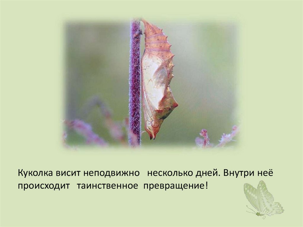 Куколка висит неподвижно несколько дней. Внутри неёпроисходит таинственное превращение!
