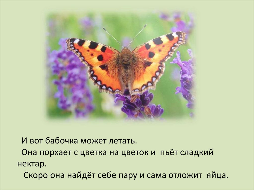 И вот бабочка может летать.Она порхает с цветка на цветок и пьёт сладкий