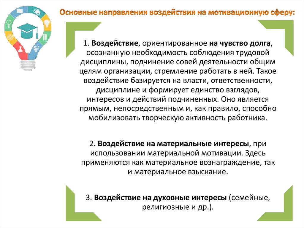 1. Воздействие, ориентированное на чувство долга,осознанную необходимость соблюдения трудовой
