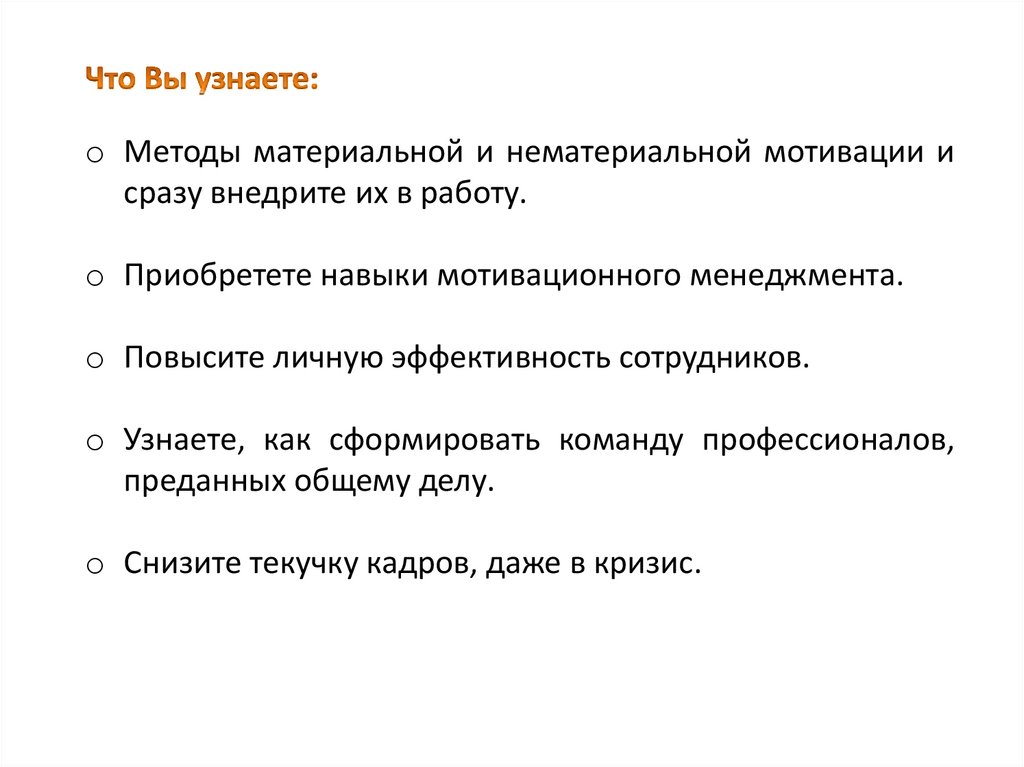 o Методы материальной и нематериальной мотивации исразу внедрите их в работу.