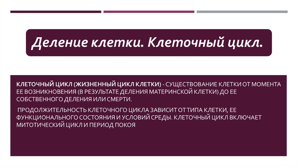 Деление клетки. Клеточный цикл.КЛЕТОЧНЫЙ ЦИКЛ (ЖИЗНЕННЫЙ ЦИКЛ КЛЕТКИ) - СУЩЕСТВОВАНИЕ КЛЕТКИ ОТ МОМЕНТА